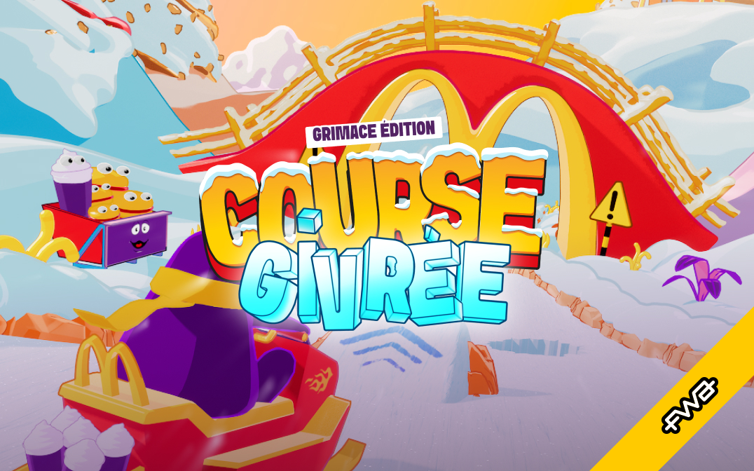 A winter race through McDonaldLand! "Course Givrée" is a fast-paced runner in which Grimace races down icy slopes on a snowmobile, collecting blueberry milkshakes while avoiding obstacles.