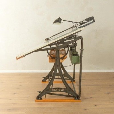 In 20th century Germany, Franz Kuhlmann was an industrial equipment manufacturer. Nestler was a company that made drafting boards. In the 1950s, the two companies collaborated on this cast iron, steel and wood adjustable drafting table: