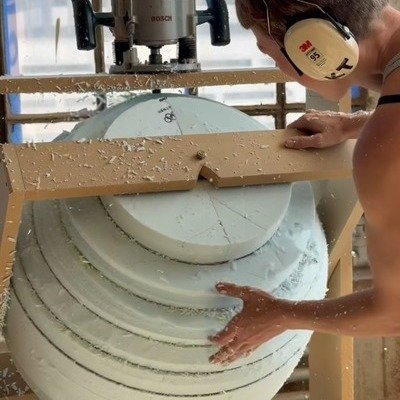 An upcoming project required them to produce a large sphere, about two feet in diameter, made out of blue foam. The firm's clever Kristin Taibl, a/k/a KT, built a simple jig that gets the job done with a regular ol' router: