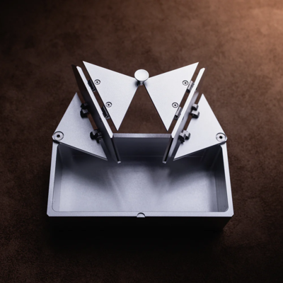 The object of theirs that we're looking at today is this butterfly-inspired Flutterbox. CNC-machined out of aluminum, it has an absurdly overengineered hinged lid system that sort of turns inside out.