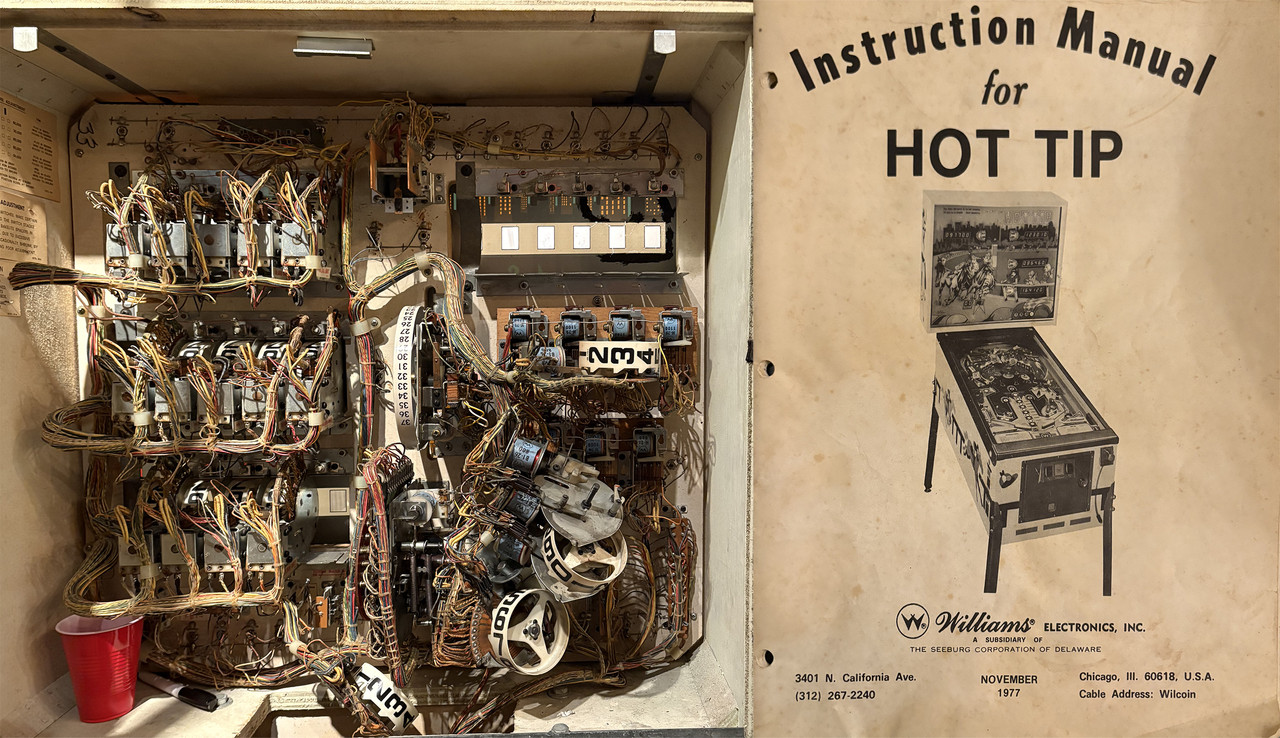 Изнанка пинбольной машины "Hot Tip" 1977 года с прилагающейся инструкцией. Музей пинбола в Рэд Хуке.
