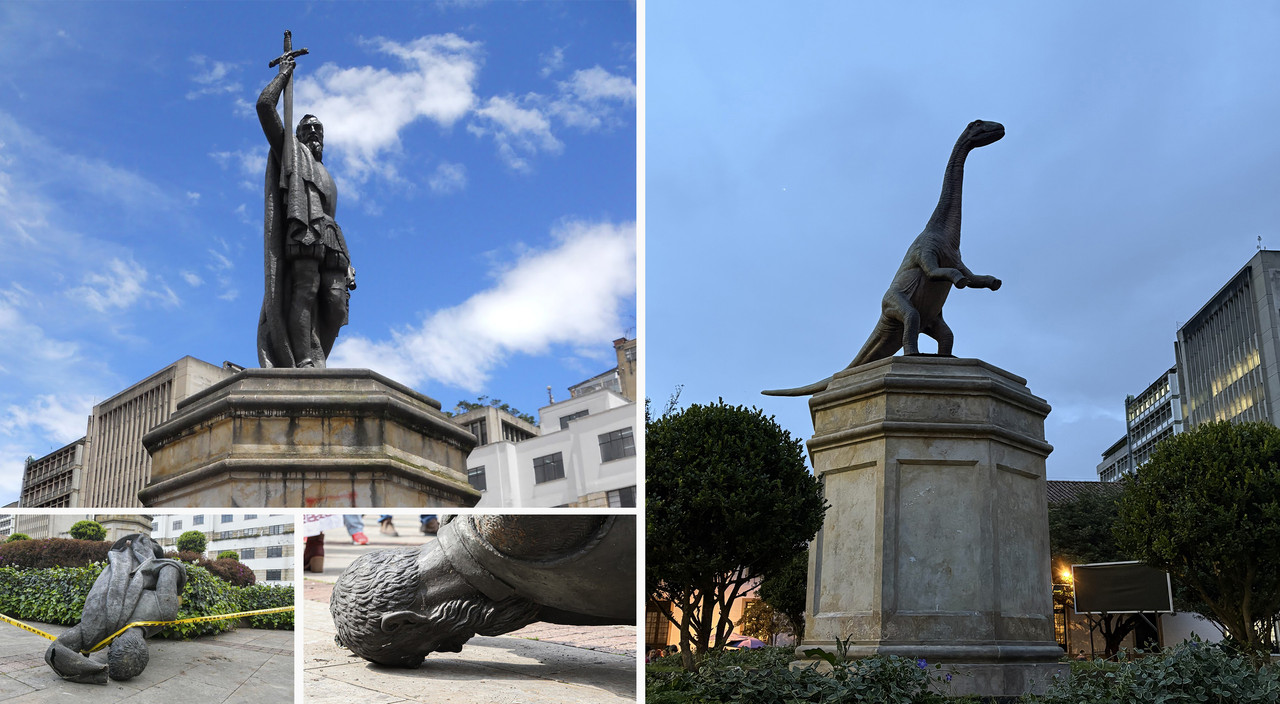 Вчера обнаружил что на пустовавшем последние пять лет пьедестале, на котором раньше возвышался памятник основателю Боготы, теперь поставили динозавра. Статуя конкистадора Гонсало Хименес де Кесада была свалена индейцами племени Мисак 7 мая 2021 года. Районный институт культурного наследия (IDPC) решил не возвращать статую на старое место - её переместили во внутренний дворик музея Боготы, но она вскоре и оттуда таинственно и окончательно исчезла.