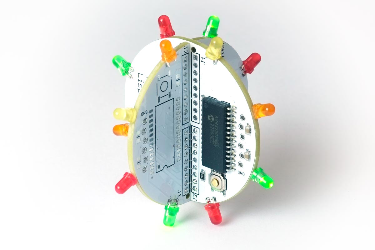 It consists of two identical circular PCBs that slot together to create a three dimensional circuit; each PCB contains eight LEDs of four different colours, and one of the PCBs houses the microcontroller and battery,