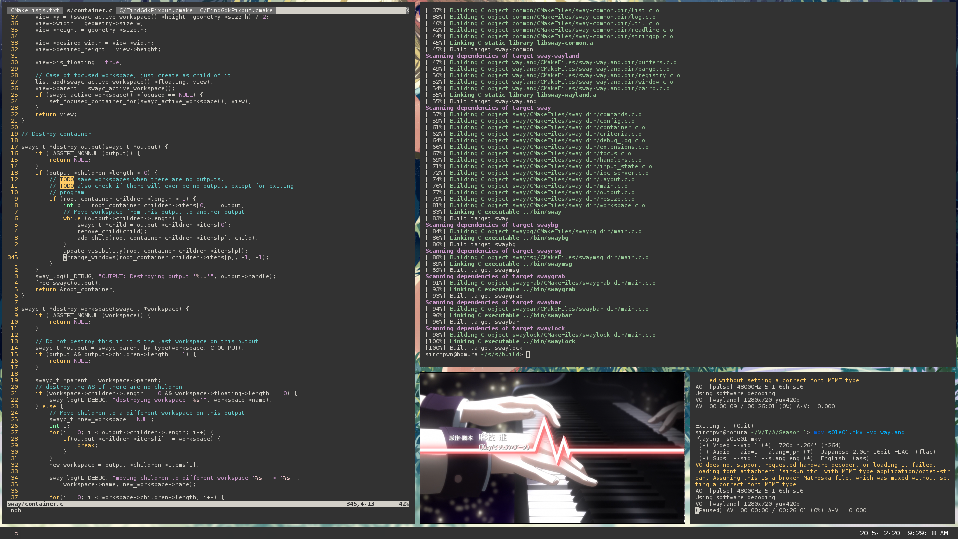I wrote sway’s initial commit 4 months ago, on August 4th. At the time of writing, there are now 1,070 commits from 29 different authors, totalling 10,682 lines of C (and 1,176 lines of header files). This has been done over the course of 256 pull requests and 118 issues. Of the 73 i3 features we’re tracking, 51 are now supported, and I’ve been using sway as my daily driver for a while now. Today, sway looks like this: